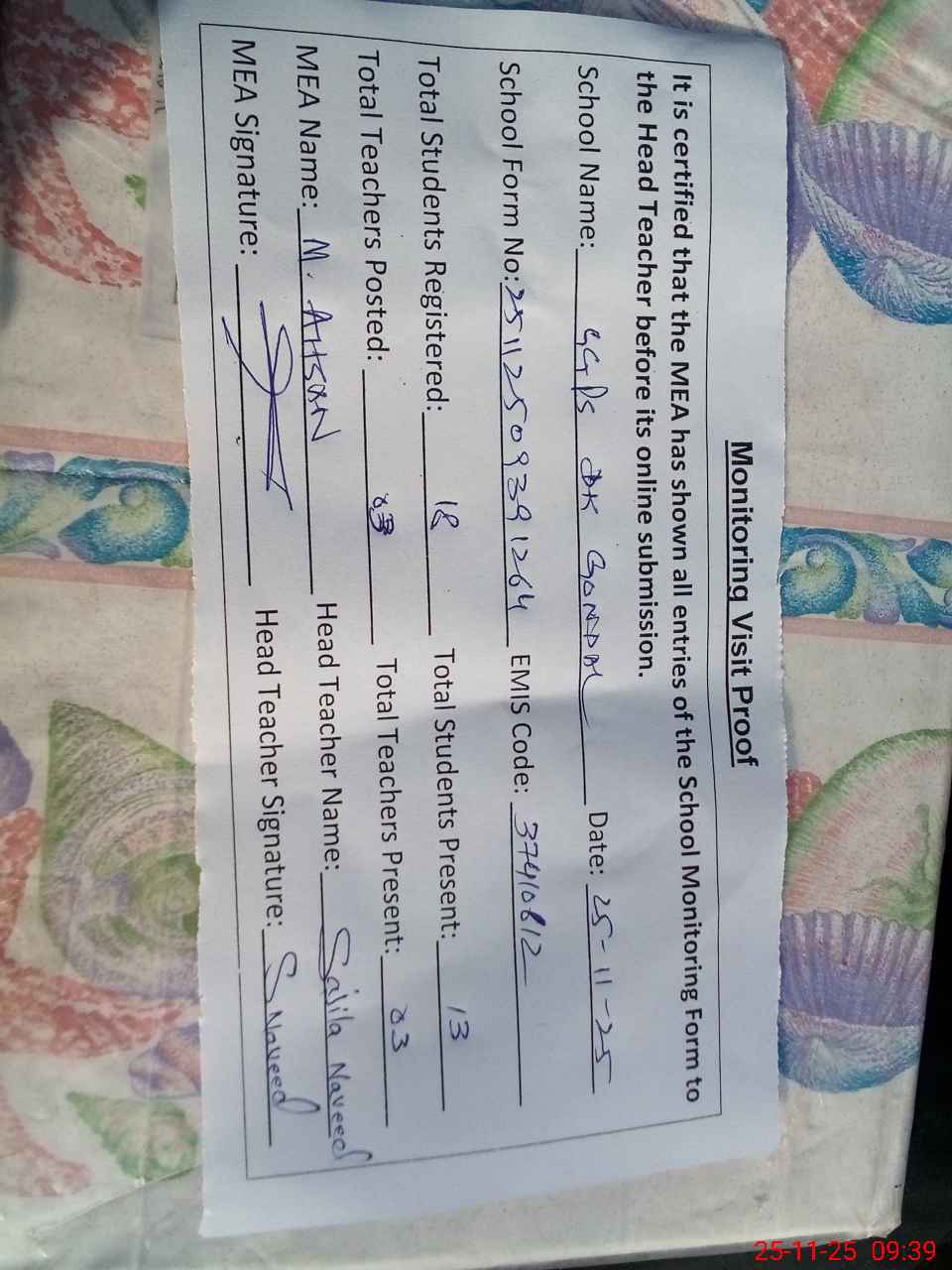 | EMIS Code: 37410612 | Name of School: GGPS DHOK GONDAL P/O DULLAH | |||