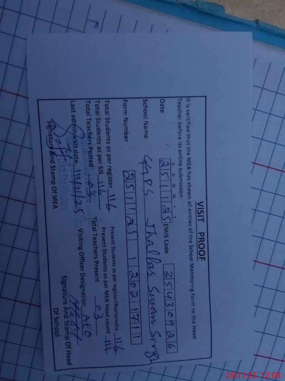 | Attendance Register | Head Teacher | MEA with School | Visit Proof |