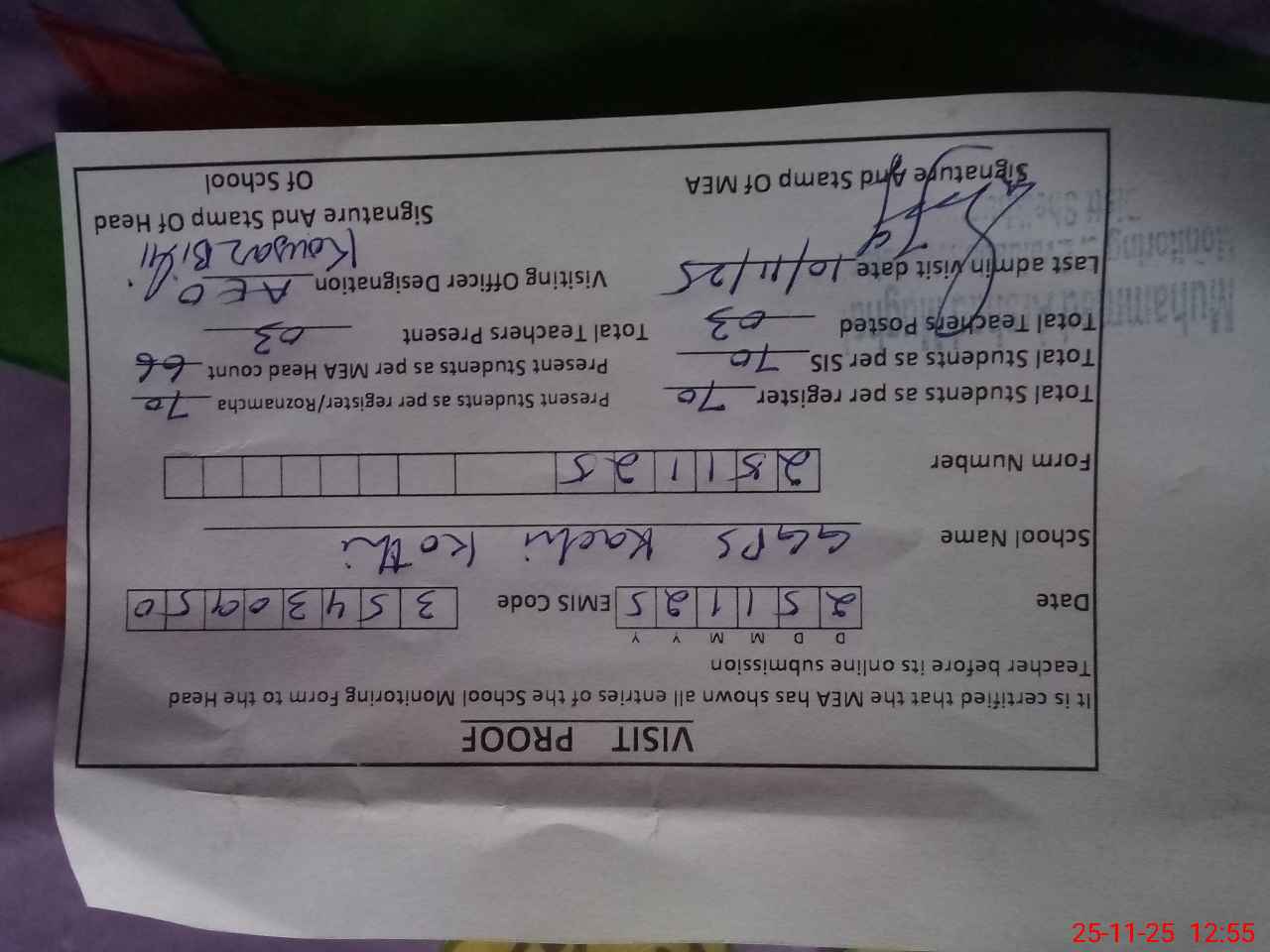| Attendance Register | Head Teacher | MEA with School | Visit Proof |