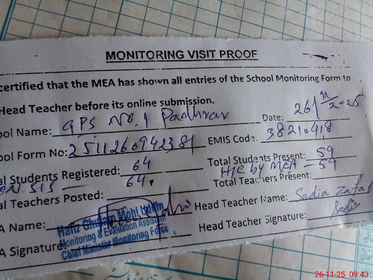 | Attendance Register | Head Teacher | MEA with School | Visit Proof |
