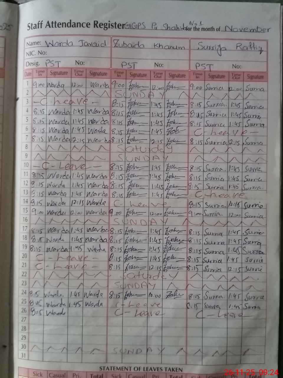 | CNIC | Full Name | Designation | R/C | Absence During Last Calender Month |