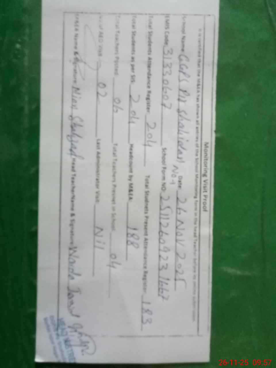 | Attendance Register | Head Teacher | MEA with School | Visit Proof |