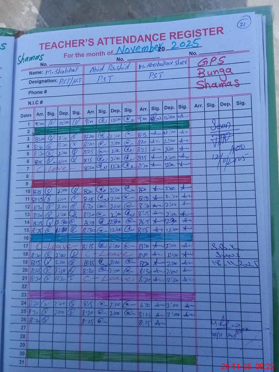 | CNIC | Full Name | Designation | R/C | Absence during last cal. month |