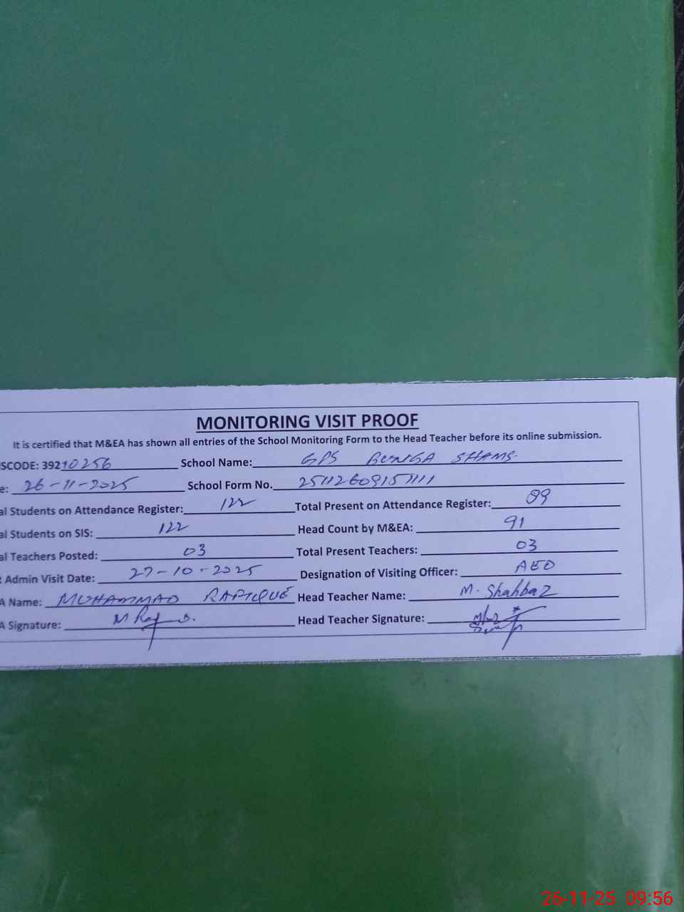 | Attendance Register | Head Teacher | MEA with School | Visit Proof |