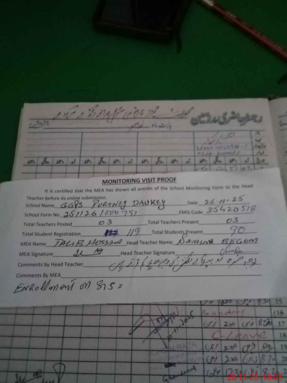 | Attendance Register | Head Teacher | MEA with School | Visit Proof |