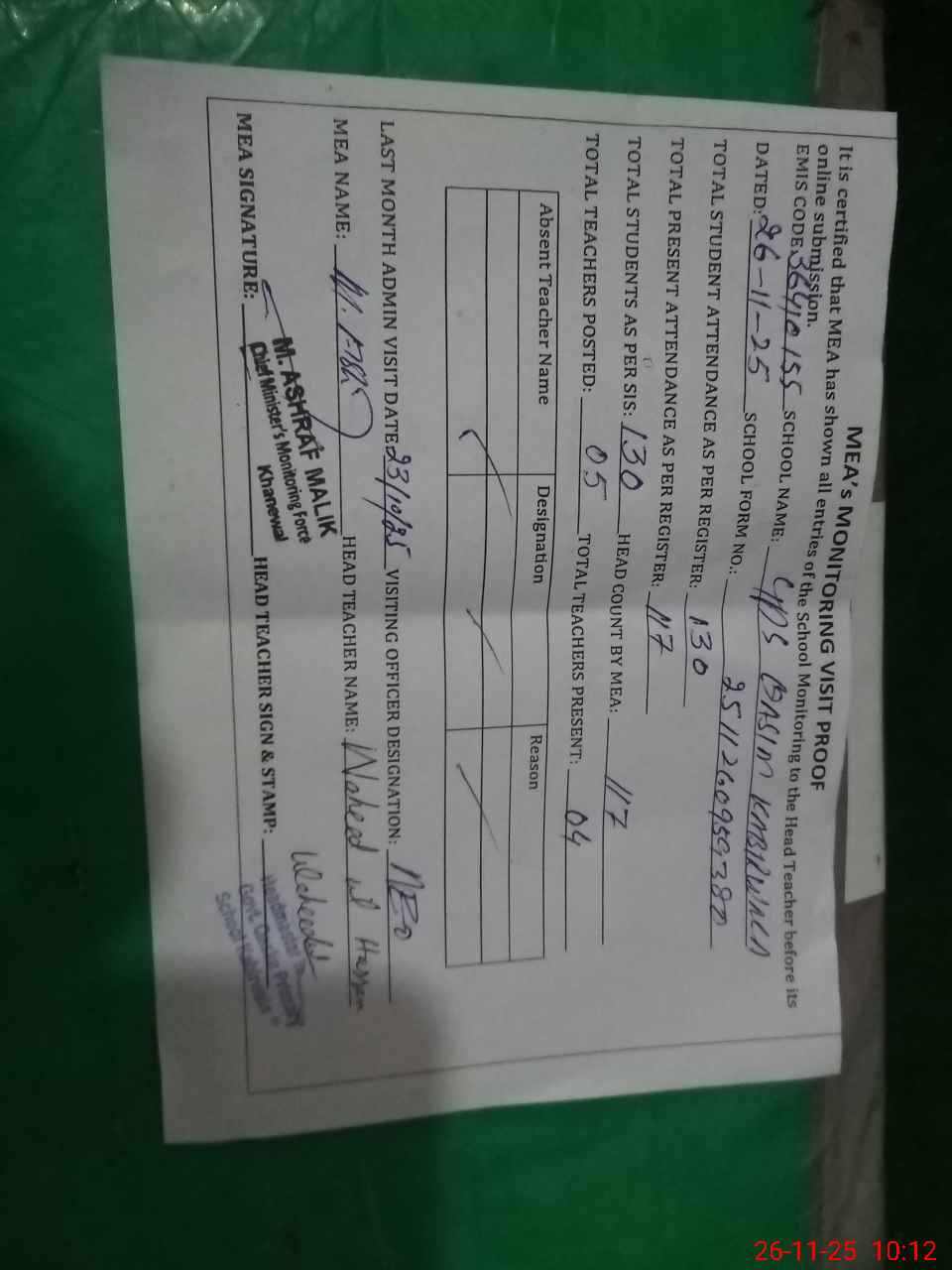 | Attendance Register | Head Teacher | MEA with School | Visit Proof |