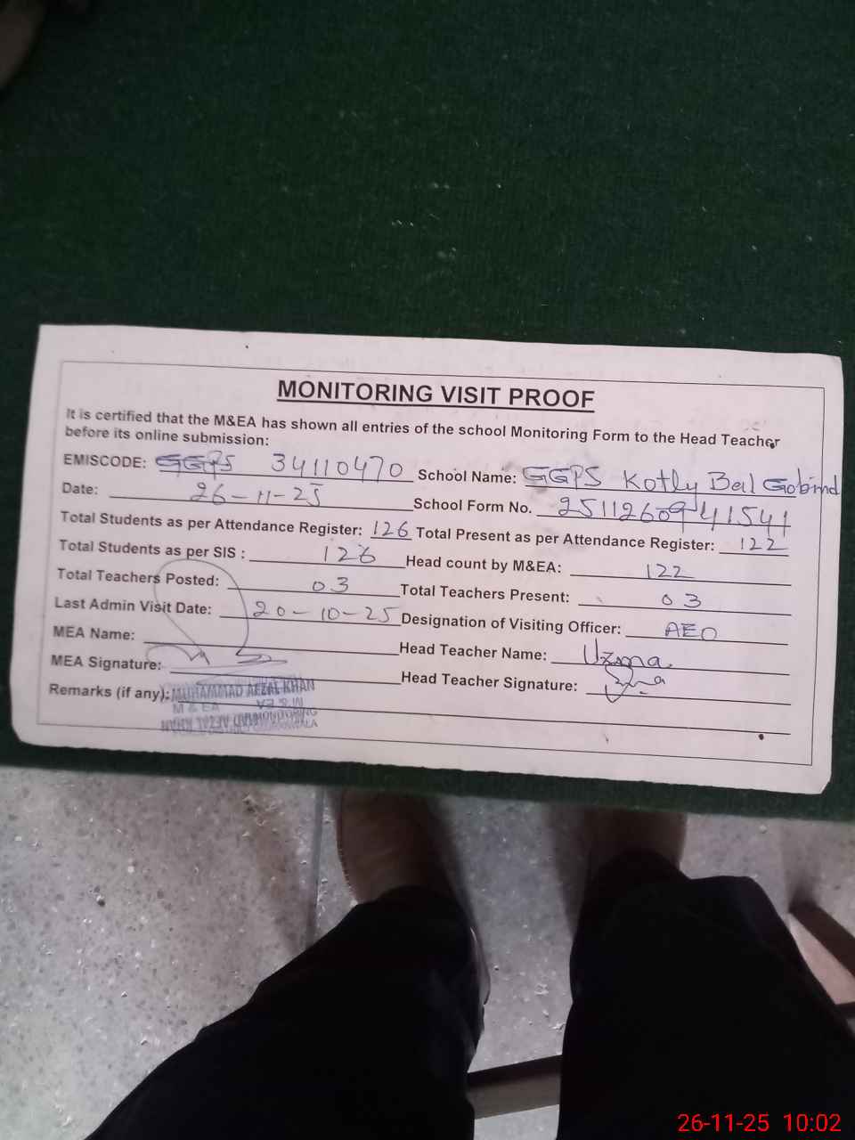 | Monitoring Date: 26-11-2025 | Start Time: 26-11-2025 09:35 AM | End Time: 26-11-2025 10:14 AM | Name of MEA: N-**** Af**** Kh**** | |