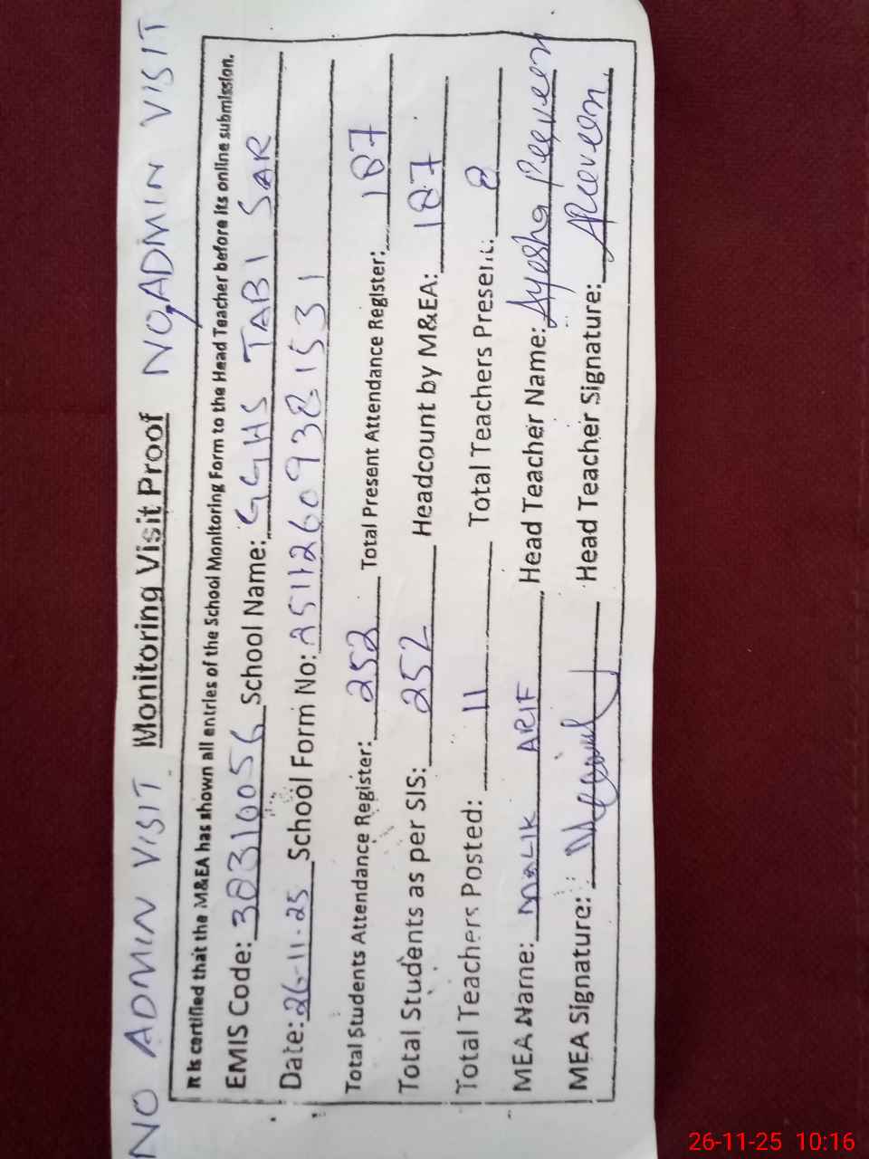 | Remarks (Use Separate Page if Required): Teacher Saima Raza marked as absent as she was not physically present Junior clerk Ahmed Hassan marked as absent as he is absent from his duty since 13th November 2025 This school consist of Three building in primary portion water not available Two toilets toilet found nonfunctional Teacher Nighat Yasmin marked as absent as she was not physically present No admin visit since unidentified time | |||||