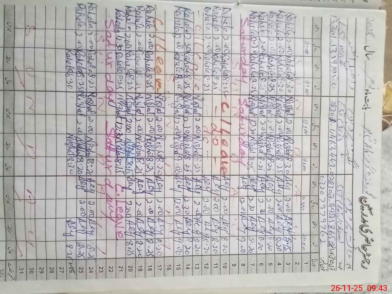 | Total no. of Classrooms: 10 No. of Classrooms Used for Teaching: 9 No. of Classrooms Storing Old Furniture, FTBs, etc: 0Comments if Any: Teacher Saima Raza marked as absent as she was not physically present Junior clerk Ahmed Hassan marked as absent as he is absent from his duty since 13th November 2025 This school consist of Three building in primary portion water not available Two toil |