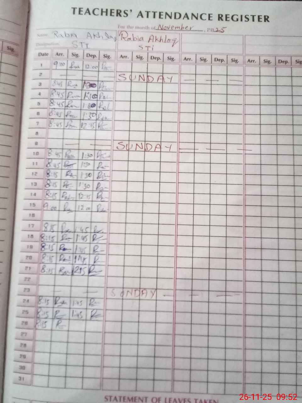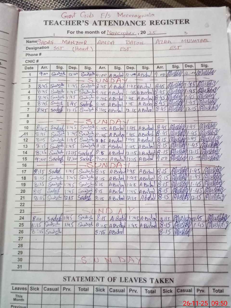 | Remarks (Use Separate Page if Required): Mali Amir Nawaz found absent since 18 November He is a habitual case He was absent 26 days in the last month | |||||