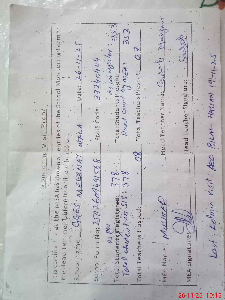 | Attendance Register | Head Teacher | MEA with School | Visit Proof |