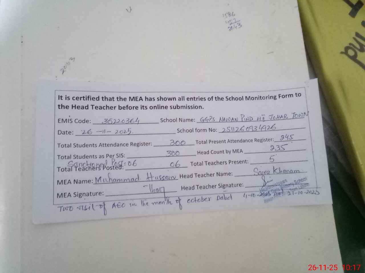 | Attendance Register | Head Teacher | MEA with School | Visit Proof |