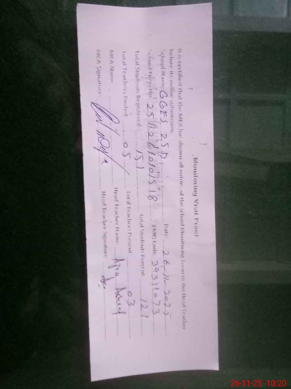 | Attendance Register | Head Teacher | MEA with School | Visit Proof |