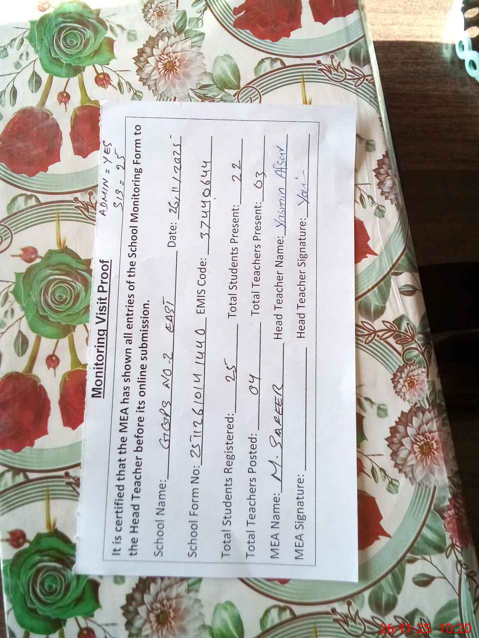 | Attendance Register | Head Teacher | MEA with School | Visit Proof |