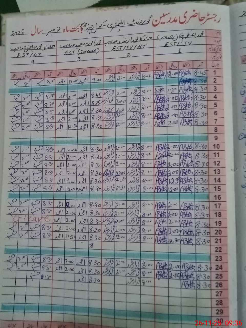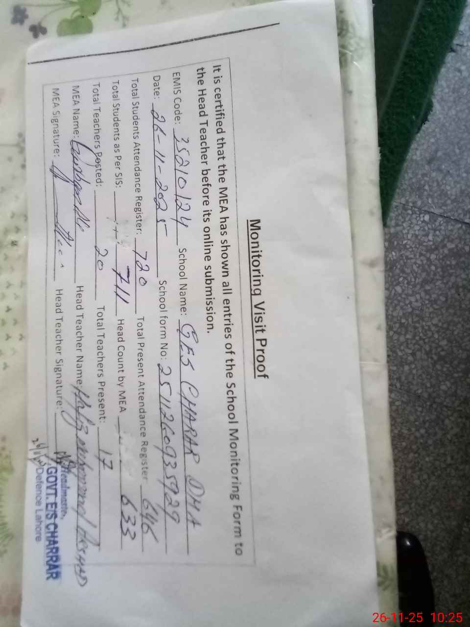 | Remarks (Use Separate Page if Required): Administrator visit of Assistant Education Officer 4th October 2025 and 30th October 2025. Administrator visit of the Dy DEO latest on 18th August 2025. Teacher Assara Ramzan Pst long absent wef 20th August 2024 to till today . Census work completed and submitted . Total students register 720 present students, 646 Total students on SIS.711 head count present students 633 | |||||