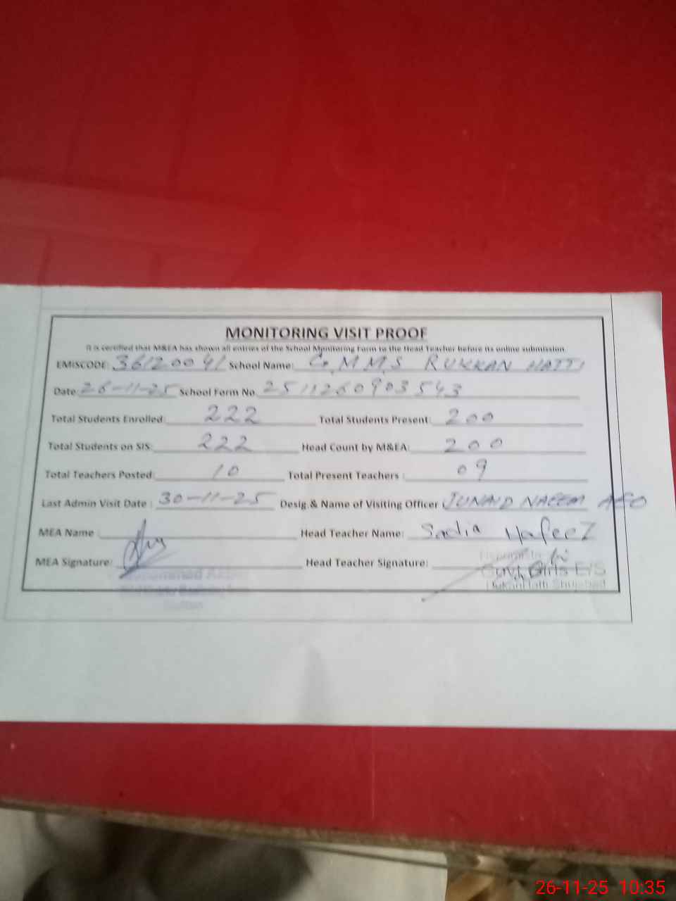| Certified that this School was Inspected by the Undersigned MEA/DMO Today and the Information Stated Above is as Per Record. | |||||