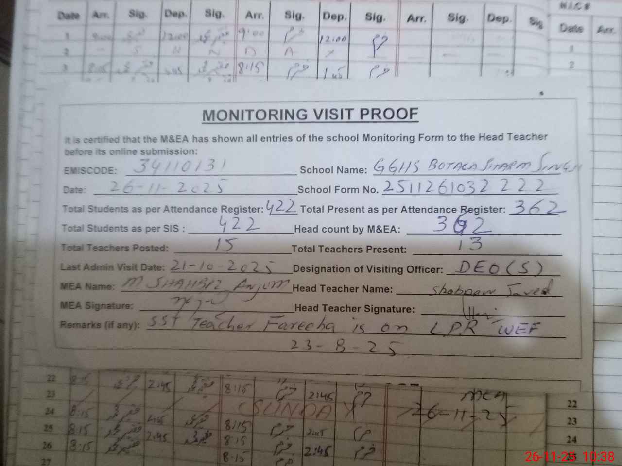 | Attendance Register | Head Teacher | MEA with School | Visit Proof |