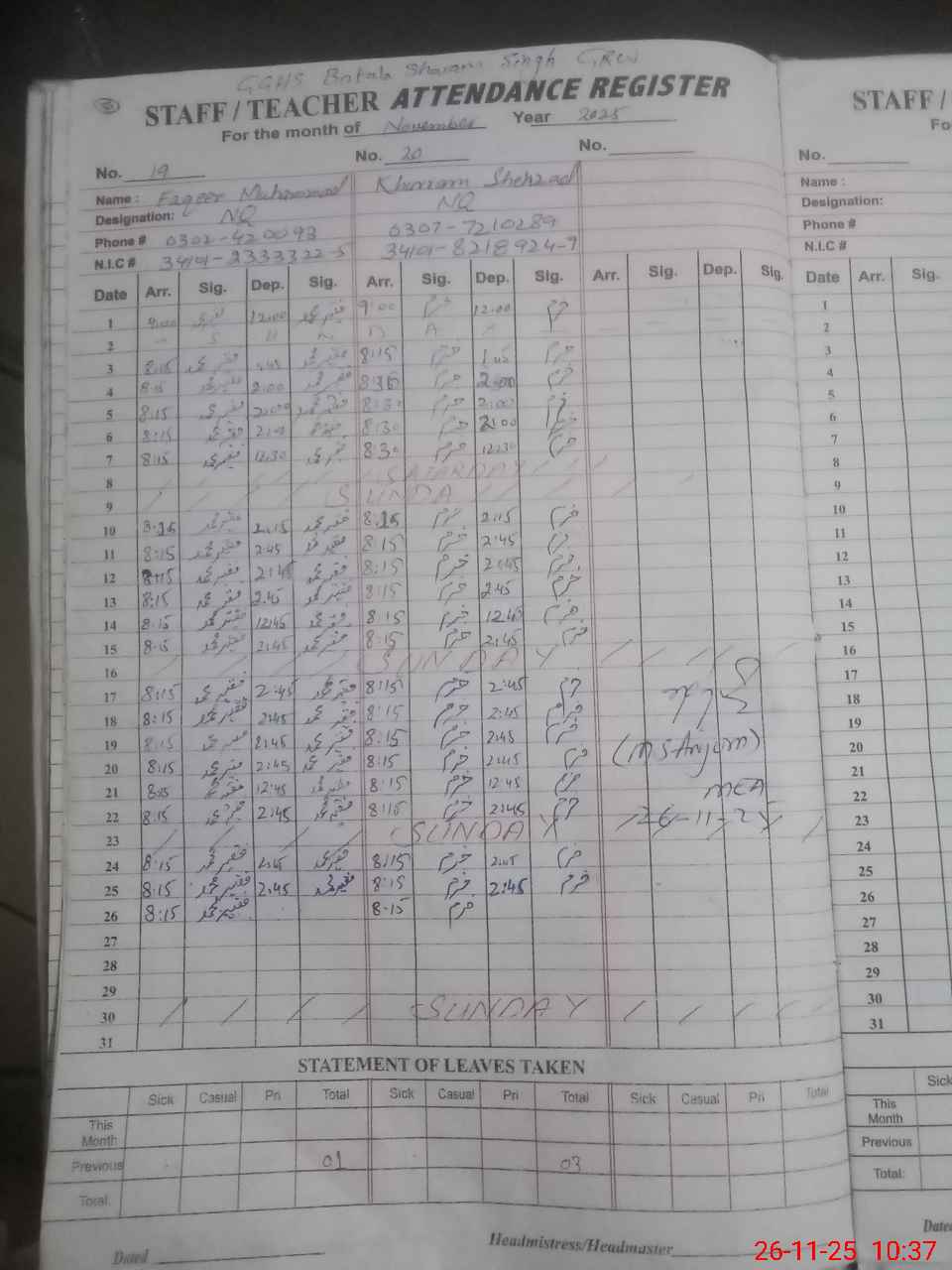 | CNIC | Full Name | Designation | R/C | Absence During Last Calender Month |