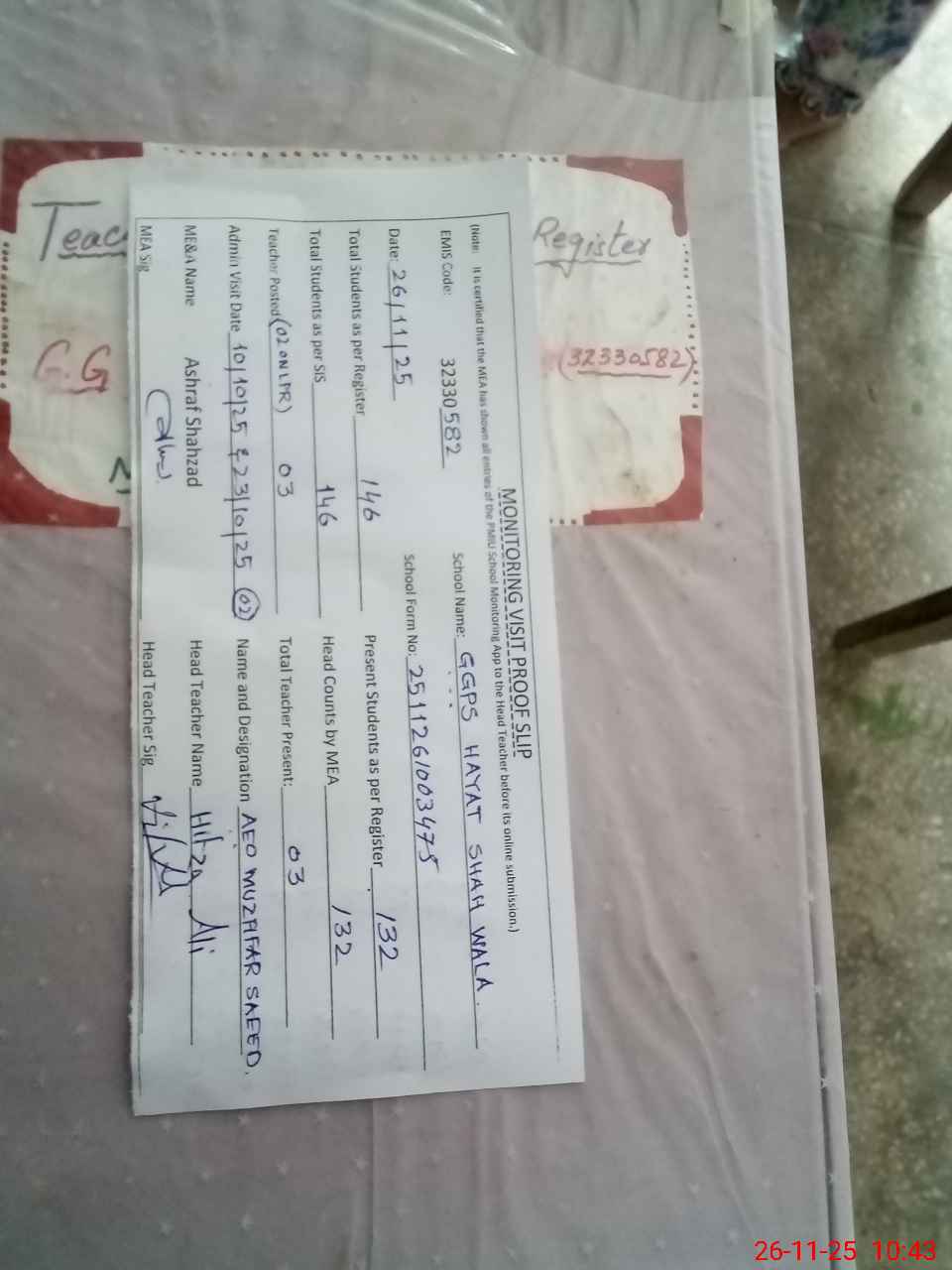 | Attendance Register | Head Teacher | MEA with School | Visit Proof |