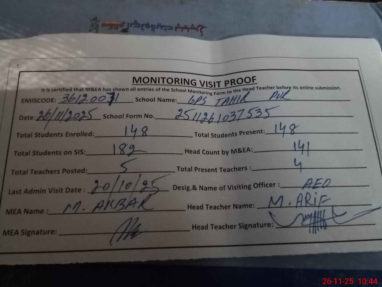 | EMIS Code: 36120071 | Name of School: GPS TAHIR PUR P/O & TEH.SHUJABAD | |||