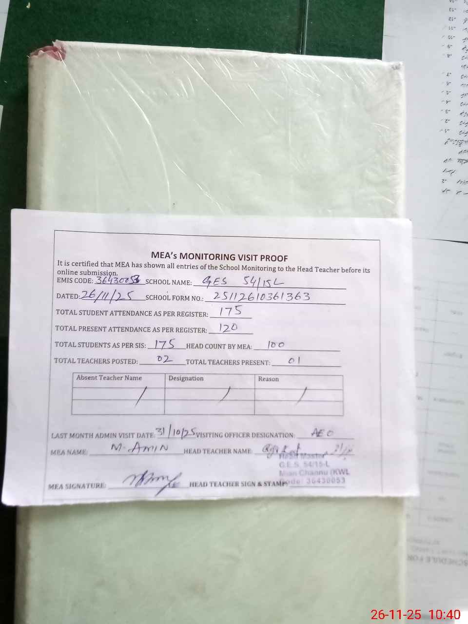 | EMIS Code: 36430053 | Name of School: GES 54/15-L, MIAN CHANNU | |||