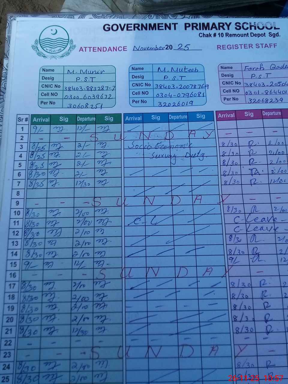 | CNIC | Full Name | Designation | R/C | Absence During Last Calender Month |