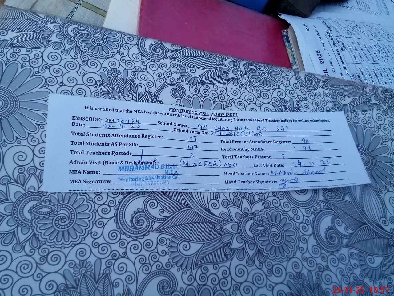 | Attendance Register | Head Teacher | MEA with School | Visit Proof |