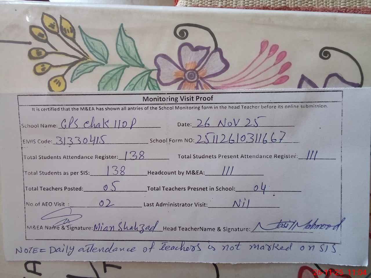 | Attendance Register | Head Teacher | MEA with School | Visit Proof |