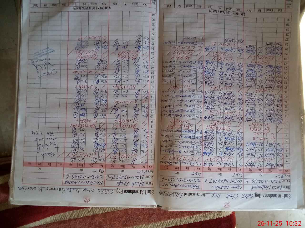 | CNIC | Full Name | Designation | R/C | Absence during last cal. month |