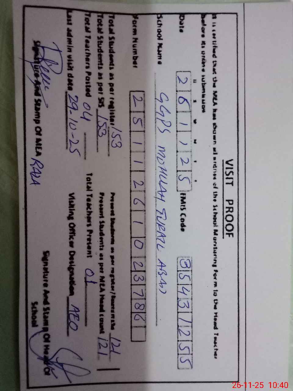 | Attendance Register | Head Teacher | MEA with School | Visit Proof |