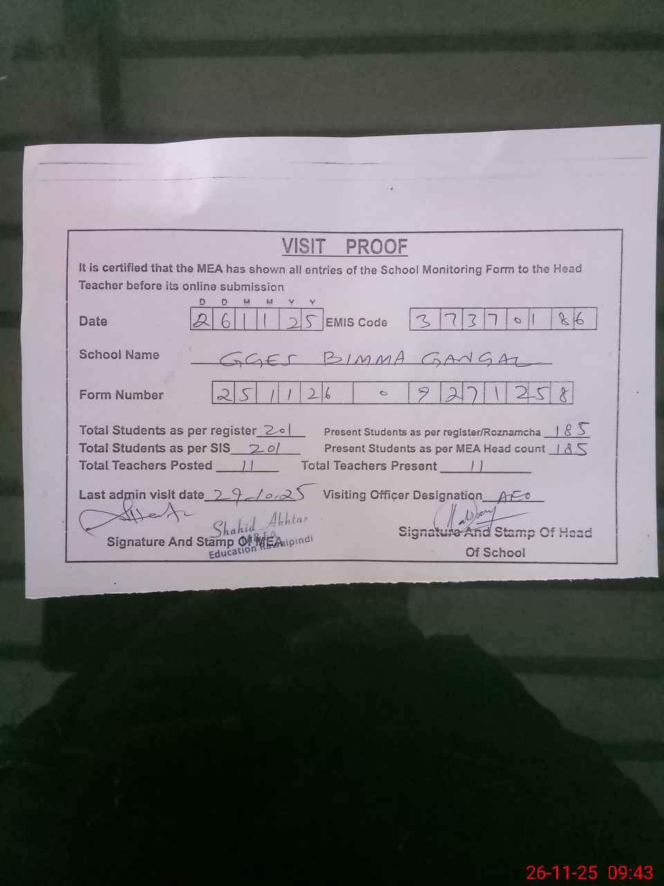 | Attendance Register | Head Teacher | MEA with School | Visit Proof |