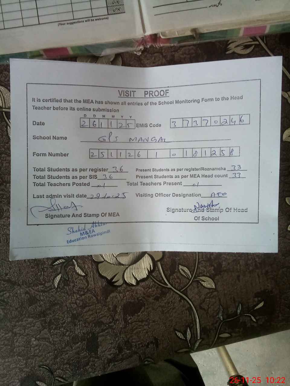 | Attendance Register | Head Teacher | MEA with School | Visit Proof |