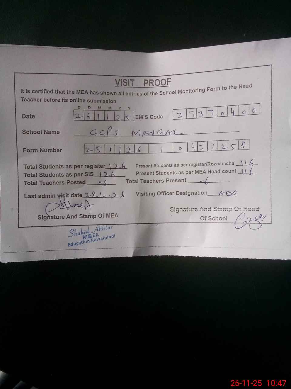 | Attendance Register | Head Teacher | MEA with School | Visit Proof |
