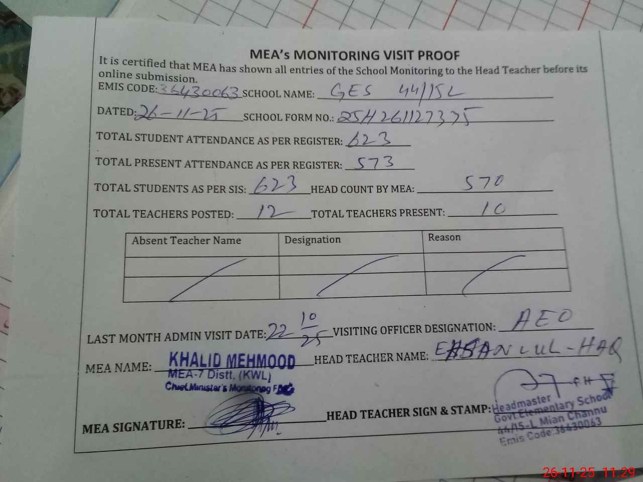 | Attendance Register | Head Teacher | MEA with School | Visit Proof |