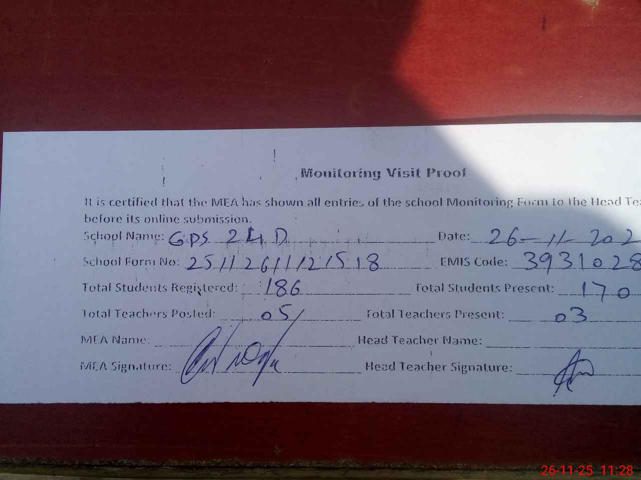 | Attendance Register | Head Teacher | MEA with School | Visit Proof |