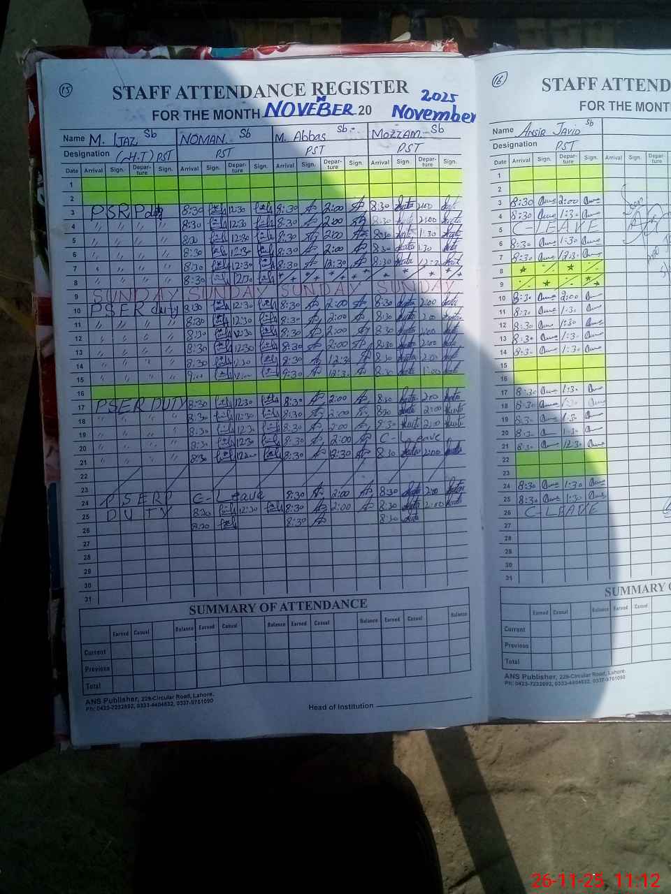 | CNIC | Full Name | Designation | R/C | Absence During Last Calender Month |