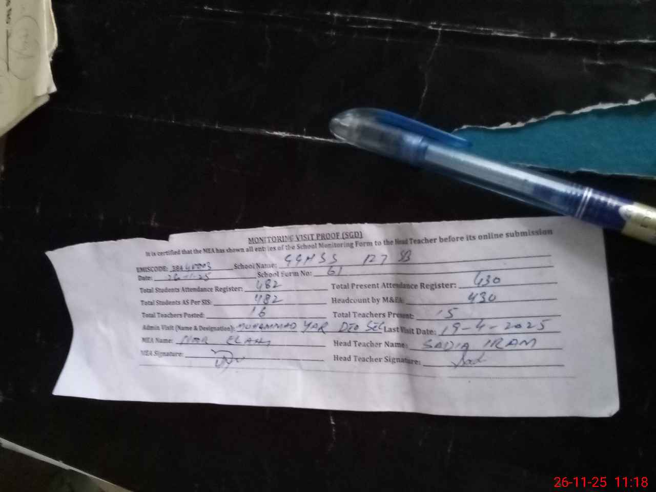 | Attendance Register | Head Teacher | MEA with School | Visit Proof |