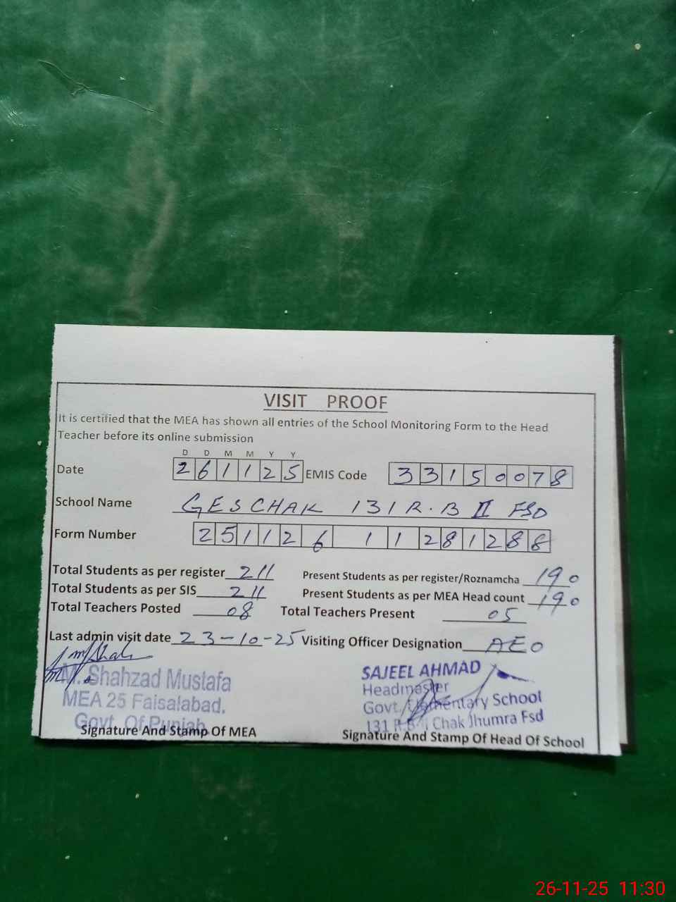 | Attendance Register | Head Teacher | MEA with School | Visit Proof |