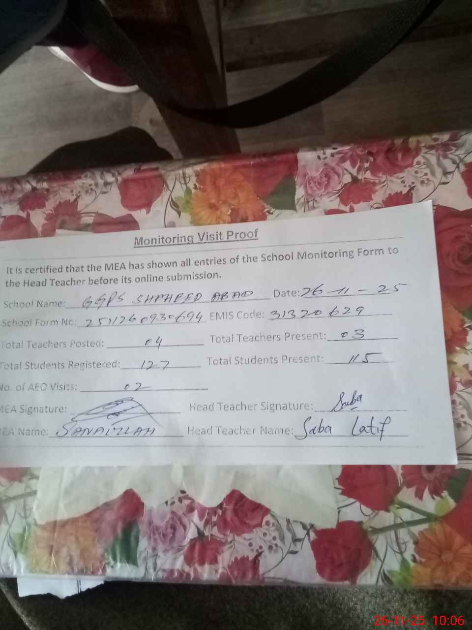 | Monitoring Date: 26-11-2025 | Start Time: 26-11-2025 09:30 AM | End Time: 26-11-2025 10:06 AM | Name of MEA: Mu**** Sa**** Ul**** Sa**** | |