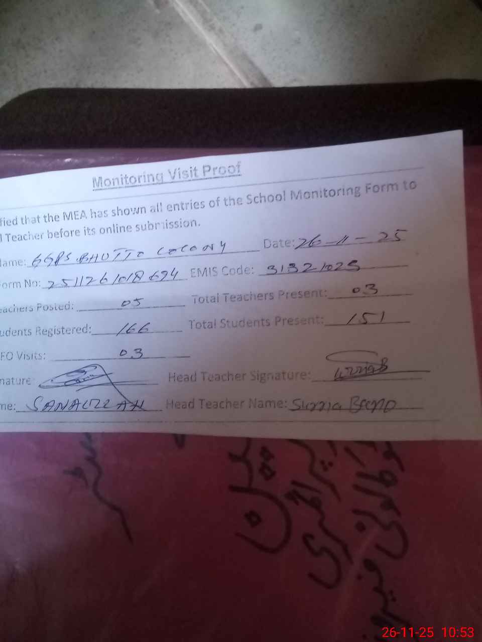 | Monitoring Date: 26-11-2025 | Start Time: 26-11-2025 10:18 AM | End Time: 26-11-2025 10:53 AM | Name of MEA: Mu**** Sa**** Ul**** Sa**** | |