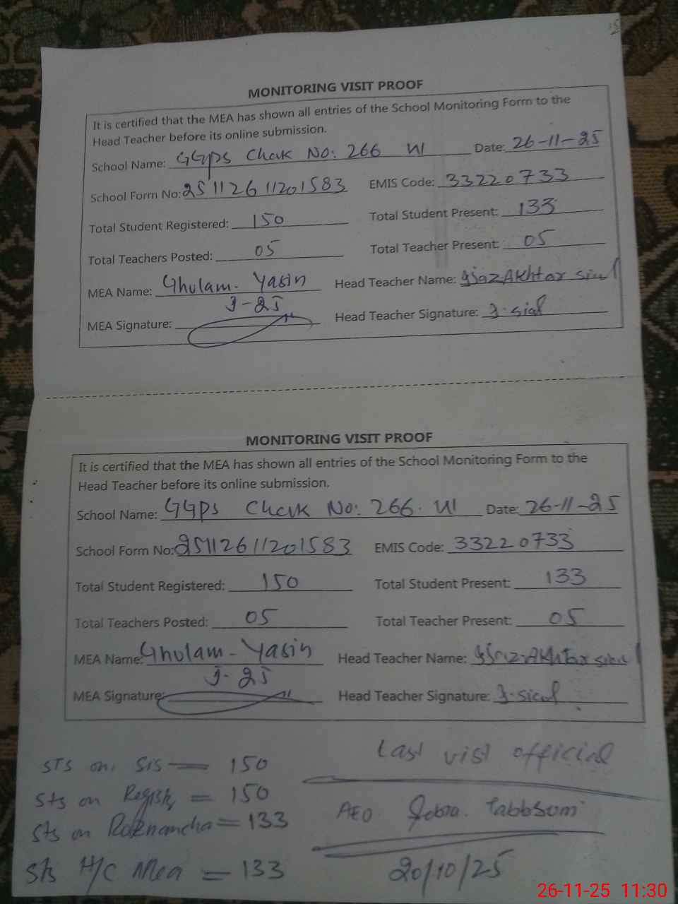 | Attendance Register | Head Teacher | MEA with School | Visit Proof |