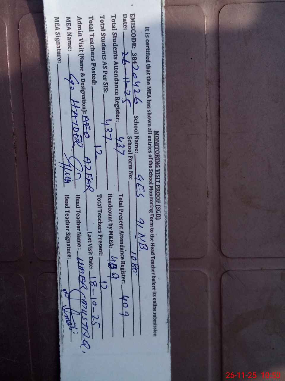 | Attendance Register | Head Teacher | MEA with School | Visit Proof |