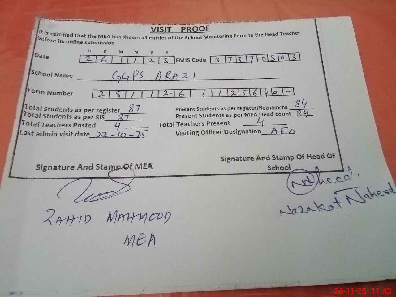 | Attendance Register | Head Teacher | MEA with School | Visit Proof |