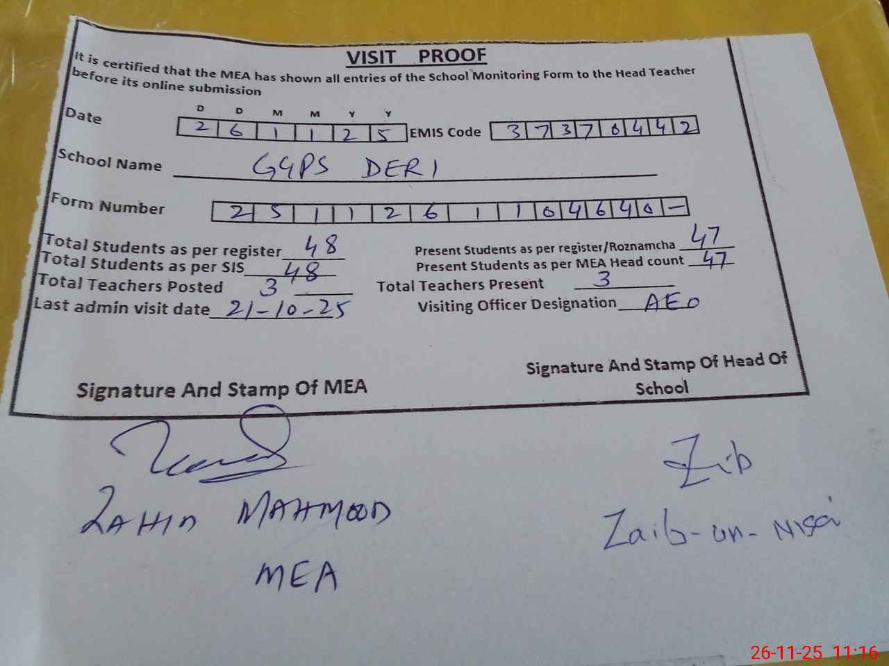 | Attendance Register | Head Teacher | MEA with School | Visit Proof |