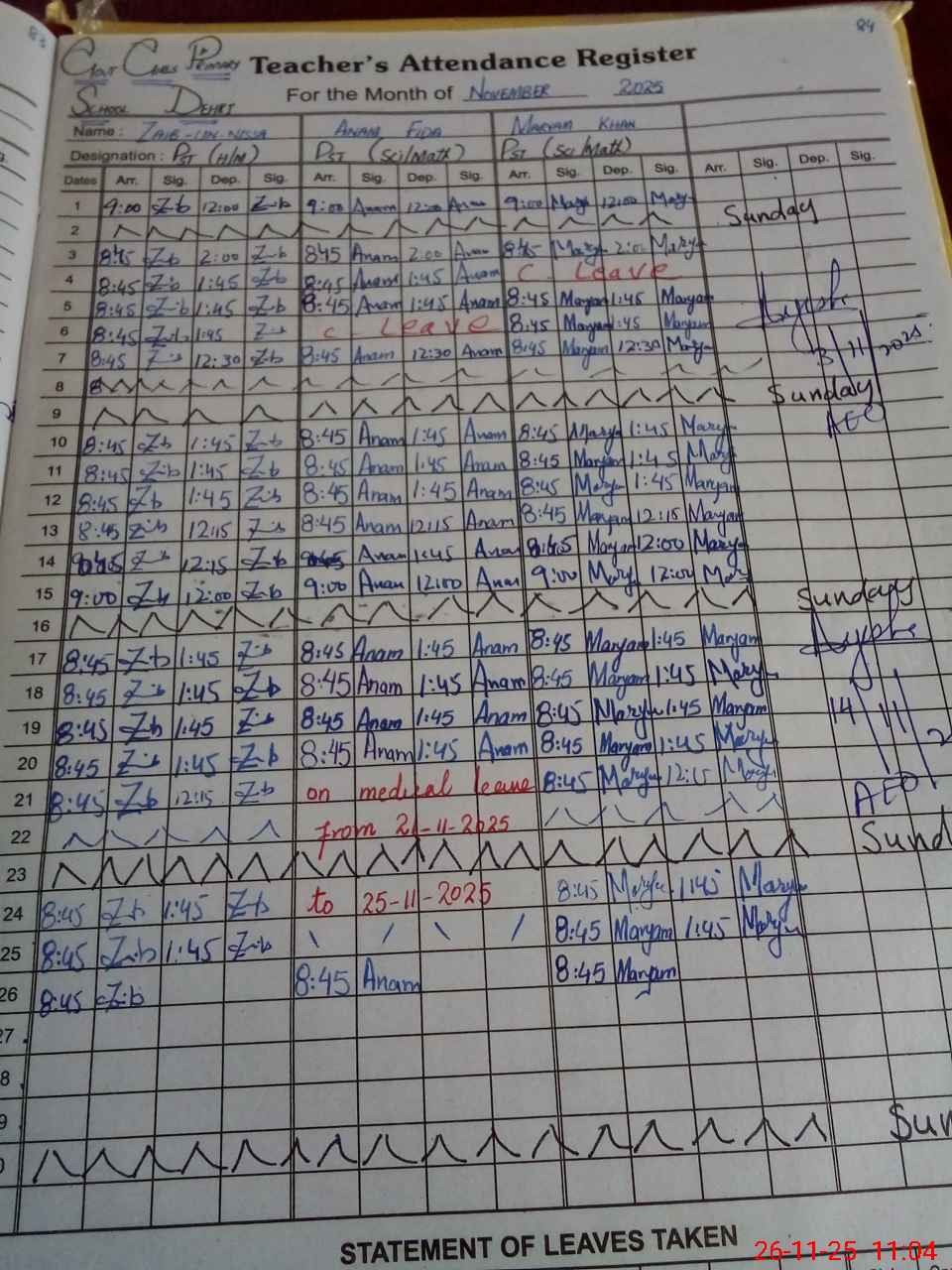 | Leave | Duty | Absent | Maternity | Medical | Ex- Pak |