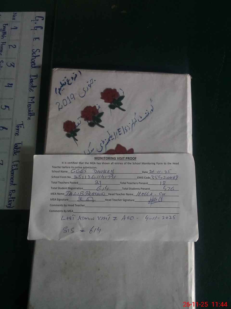 | Attendance Register | Head Teacher | MEA with School | Visit Proof |