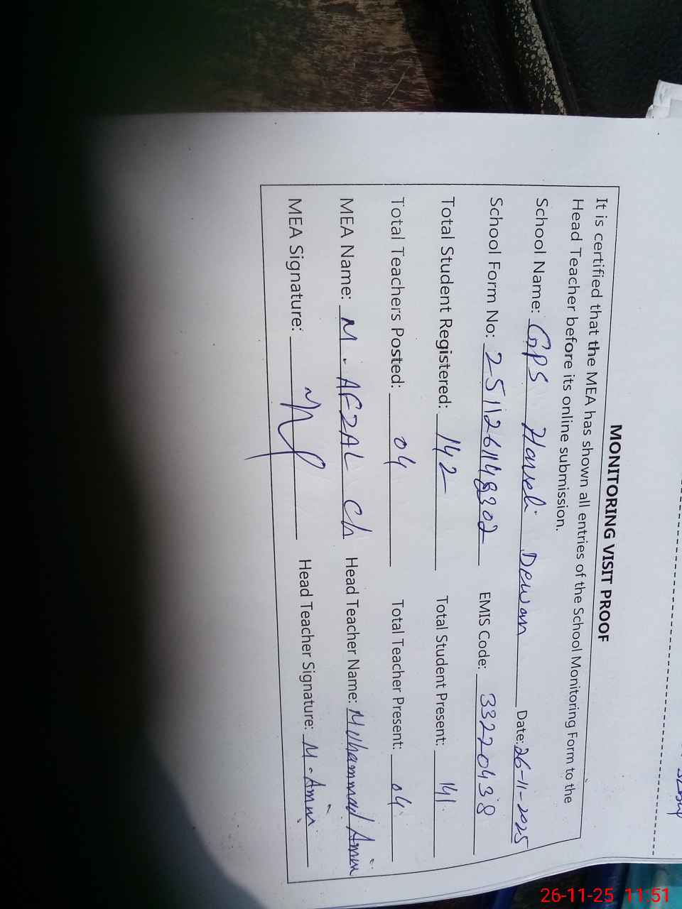 | Attendance Register | Head Teacher | MEA with School | Visit Proof |