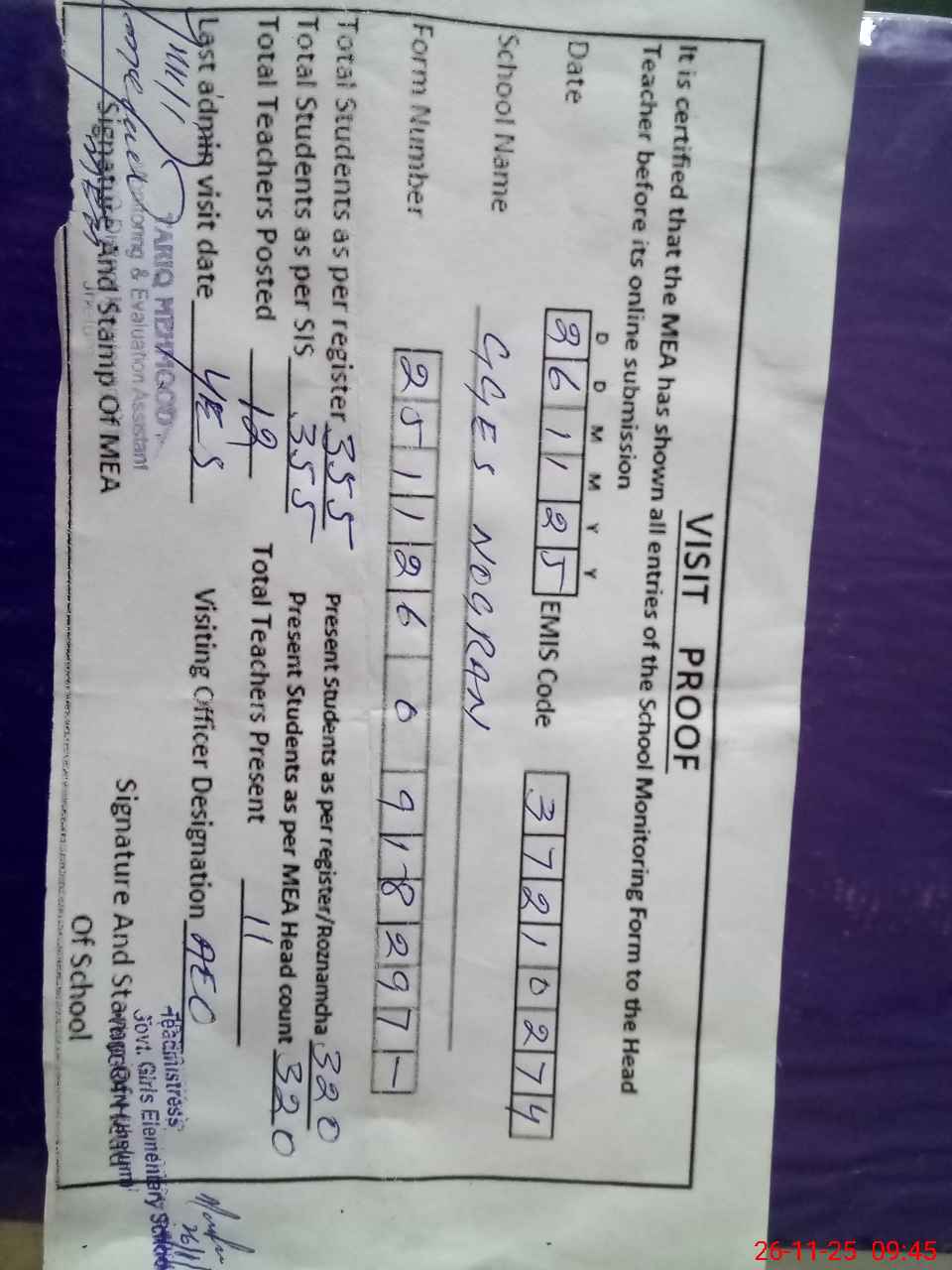 | Certified that this School was Inspected by the Undersigned MEA/DMO Today and the Information Stated Above is as Per Record. | |||||
