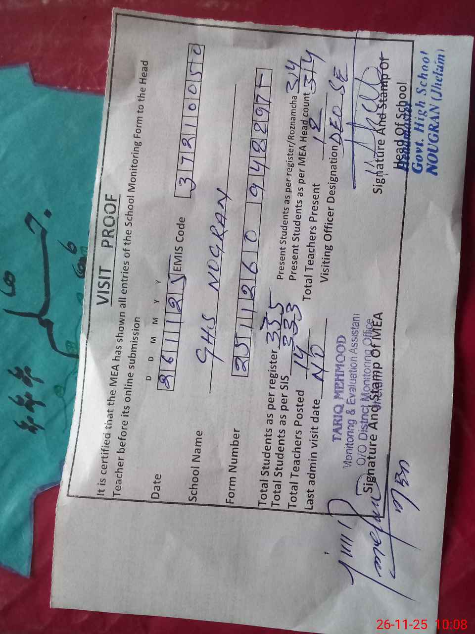 | Certified that this School was Inspected by the Undersigned MEA/DMO Today and the Information Stated Above is as Per Record. | |||||