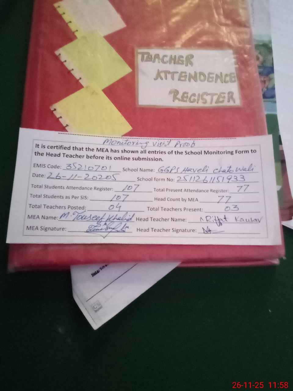 | Attendance Register | Head Teacher | MEA with School | Visit Proof |